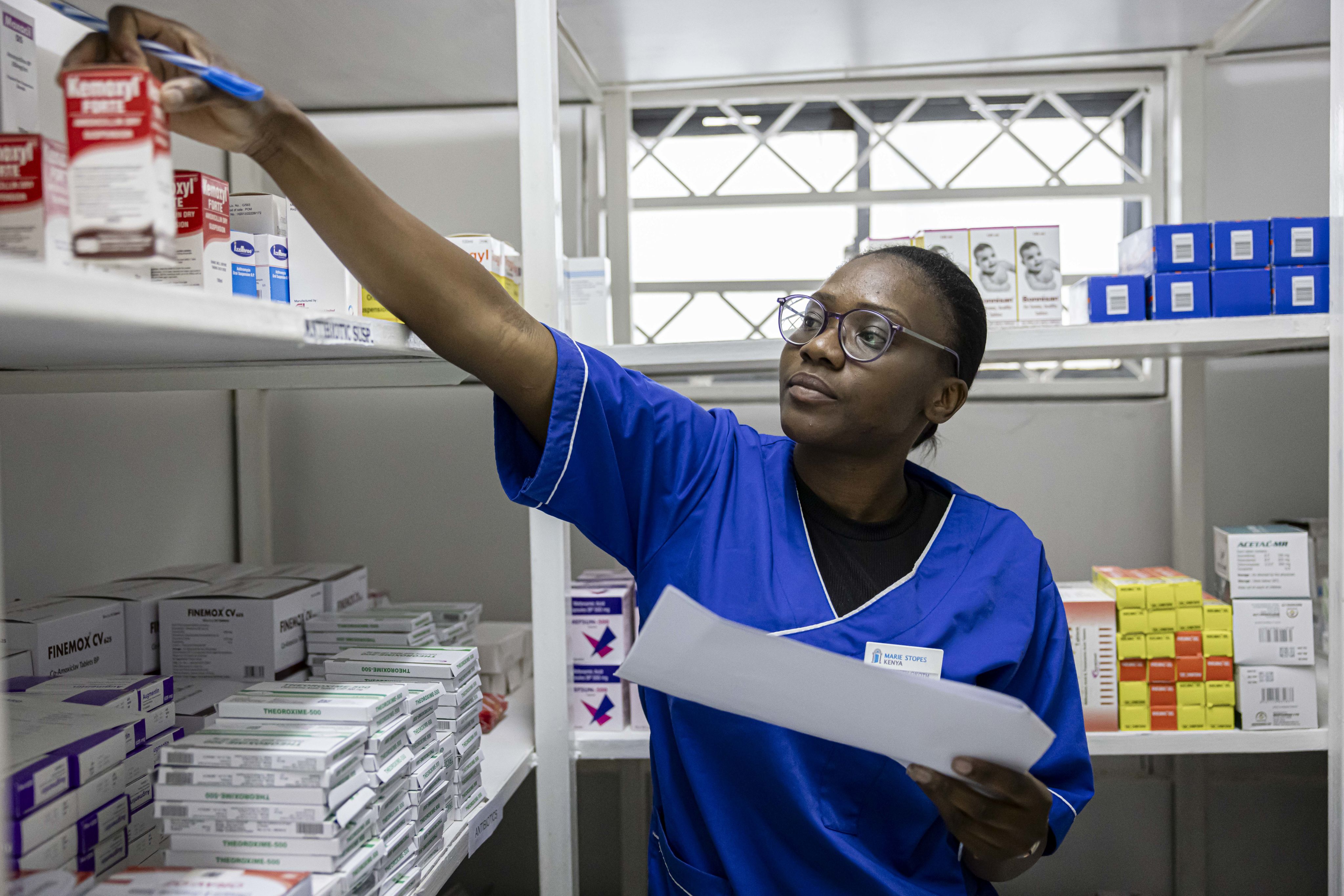 Elizabeth, a pharmacist, checks inventory at an MSI clinic in Nairobi